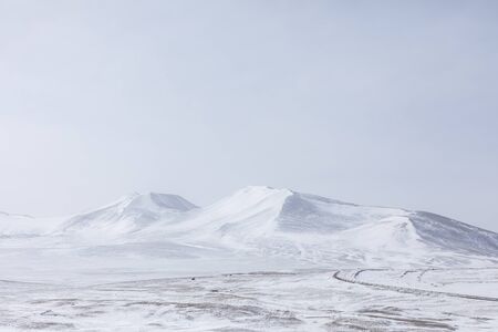 Snow land in Mongolia. The road is far away through the snow-capped hills. Winter wilderness.