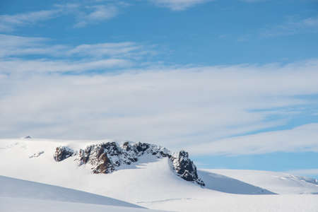 Beautiful winter landscape in Antarctica with snow covered mountains and blue sky