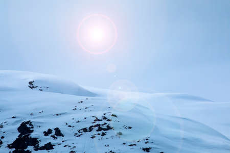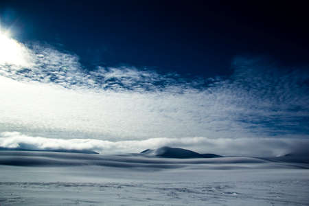 Winter landscape of high mountains with snow blizzard and fresh blue sky, beautiful nature panoramic background