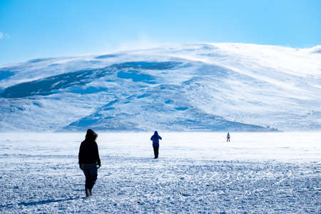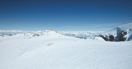 Panoramic view frozen Paravani lake in winter in sunny day.Tranquil winter landcape