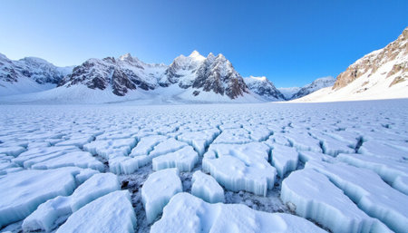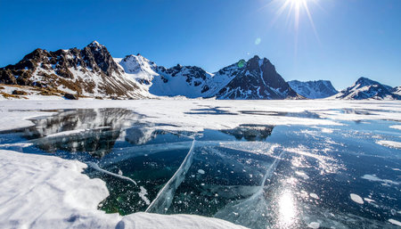 Scenic view showcasing a frozen lake with intricate cracks in the ice, reflecting majestic snowy mountain peaks in the background, creating a tranquil winter landscape
