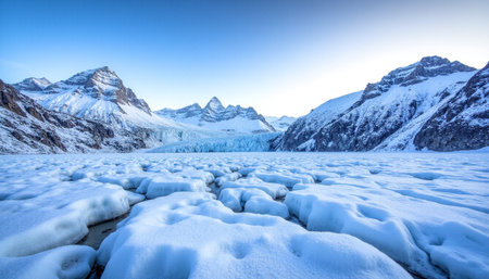 An AI generated illustration of A stunning tranquil scene featuring a lake filled with ice surrounded by towering snow-capped mountains