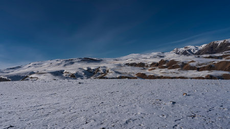 The mountains with red-brown slopes are covered with snow. A scattering of stones and footprints are visible in the valley. clear blue sky. Altai Mars Kyzyl Chin