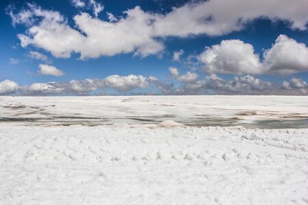 white snow in building beautiful sea winter ambiance with large blue sky in he sky surface hills in the background.