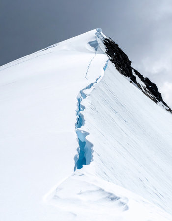 A stark and minimalist view of a mountain summit, where a deep crevasse reveals the ancient blue ice of the glacier beneath.