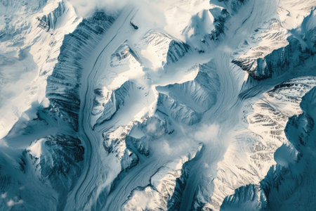 Top-down drone view of rugged alpine mountains with snow-capped peaks. AI generated.