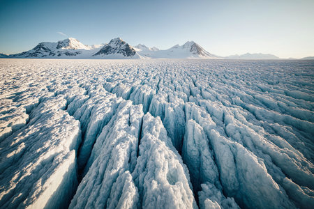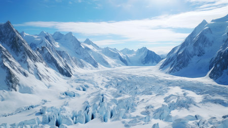 Explore a stunning winter landscape featuring majestic snow-covered mountains and a vast glacier under a bright sky, showcasing the beauty of nature's tranquility and cold allure.