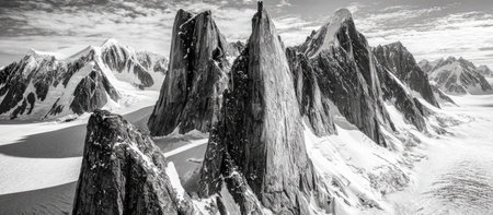 Scientific exploration of glacial valleys beneath towering mountain peaks in nature's majestic landscape