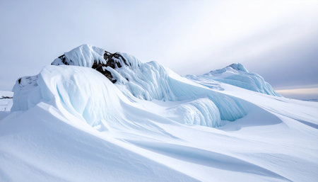 Experience the tranquility of a breathtaking winter landscape showcasing majestic snow-capped mountains under a soft blue sky, perfect for capturing nature's beauty.