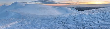Mountain ridge sunrise panorama view (Ukraine, Carpathian Mt's, Drahobrat ski resort). Six shots stitch image.