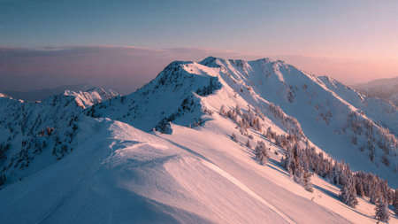 Snow-covered peaks glow under a gentle sunrise, blending pastel skies with crystal-clear winter atmosphere.