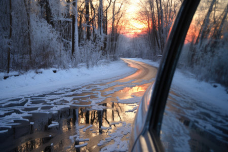 Winter road scene at sunset puddles, ice covered river, and reflective beauty of nature