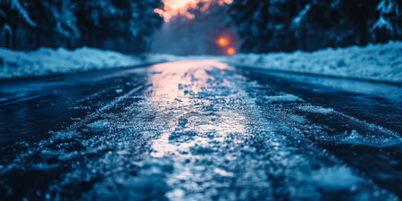 A mesmerizing closeup view of a slick and icy road is beautifully illuminated by a soft, warm glow, while being embraced by snowcovered trees during a peaceful and serene winter night in nature