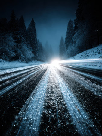 Bright tire tracks cut through a frosty road in a winter landscape, highlighting the importance of safety during icy conditions at night.