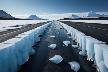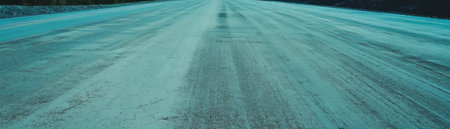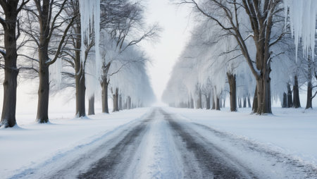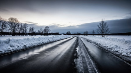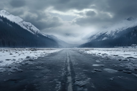 The only evidence of human activity on this remote road lies in the frozen imprints of tire tracks stretching on for miles. . AI generation