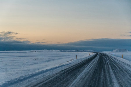 Winter road replaced by snow. Typical icelandic landscape in early spring. Northern Europe. Iceland.