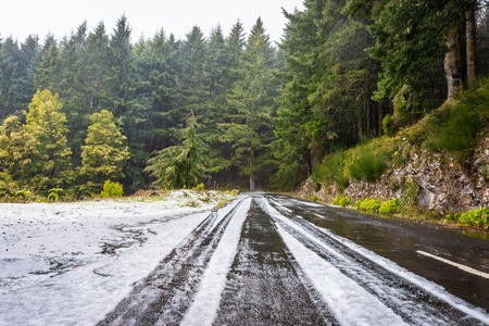 Thick ice and snow at the road to Pico Ruivo, Madeira mountain, Portugal. Bad weather on Madeira island.
