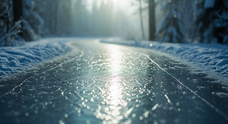A cracked, frozen icy road winds through a snow-covered forest, with sunlight glinting brightly off the ice surface.