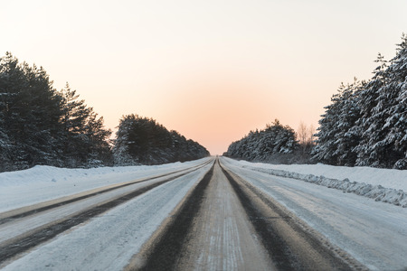 Snowy road in the winter forest at sunset. Beautiful winter landscape.