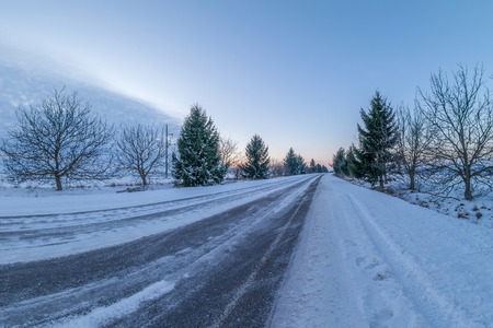 winter road with ice on the asphalt, trees under snow during the winter frost in Russia
