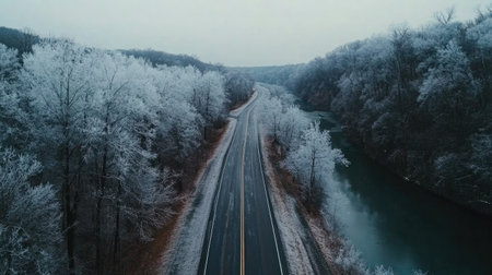 Stunning aerial image of a frost-covered road winding alongside a peaceful river, showcasing the serene beauty of winter and the tranquility of a snowy landscape.