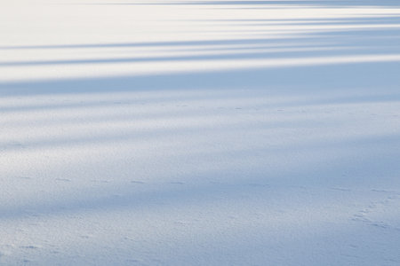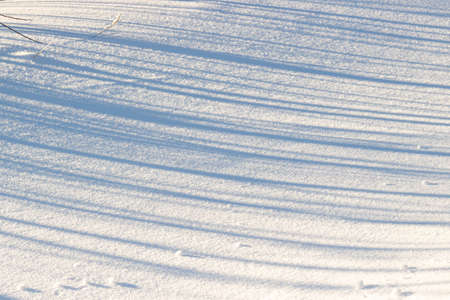 Shadow of the trees in the fluffy snow. Striped shadows on white snow look like a barcode