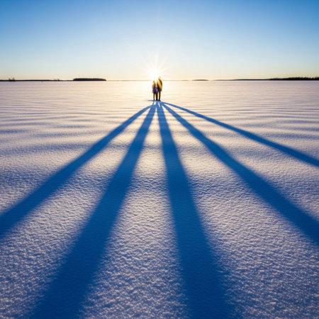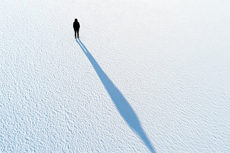 Solitary figure on a vast snow-covered landscape casting a long shadow in the bright light.