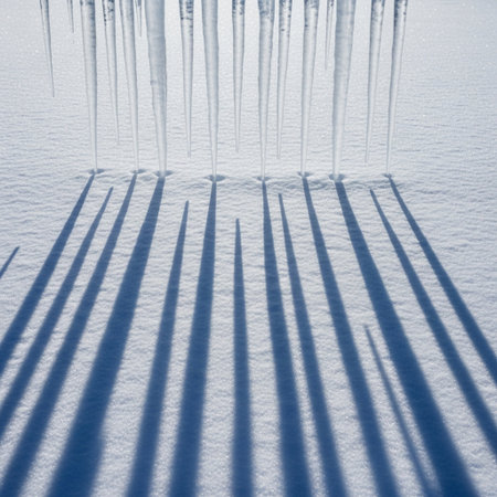 Icicles and shadows on the snow. Winter background. Snow texture.