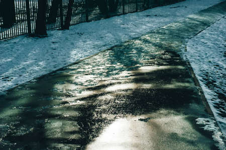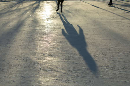 ice skating. Sliding on ice. Shadow of man on skates. Ice rink in the city.