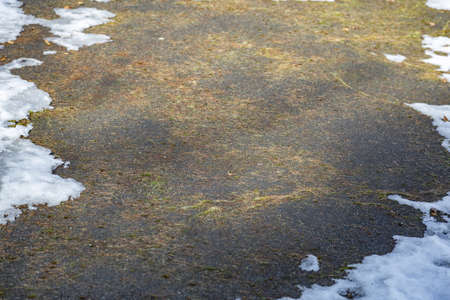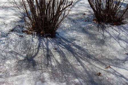 This images shows an abstract texture background of a hard frozen snow and ice covered lawn with a bare lilac bush, in late winter with freezing and thawing, giving a grungy surface texture.