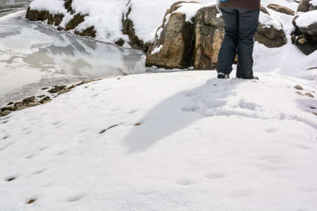 The shadow of a man in the snow. Silhouette on the ice. Winter frozen lake. Man and wires.