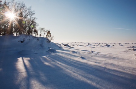 sunlit snow drifts with the shadow of the branches of a tree growing nearby, without foliage, hardwood