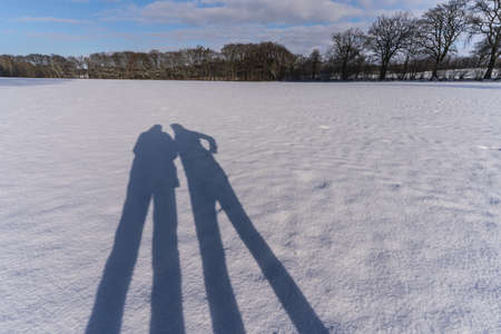 female shadow with long legs and a raised hand on fresh snow on a winter sunny day. Abstract background, light and shadow, winter fun