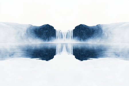 A symmetrical waterfall cascades over a cliff, creating a serene and peaceful scene.
