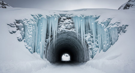 Ice cave in winter, Iceland. Panoramic view of icicles.