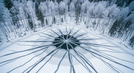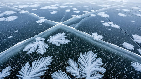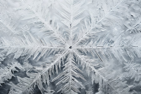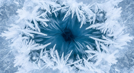 Intricate ice crystals form a beautiful starburst pattern on a frozen surface, showcasing the delicate artistry of winters touch