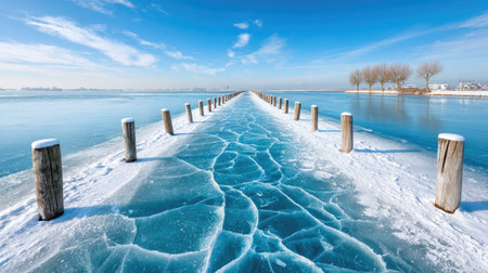 Snowflake landscape on the lake ice in winter