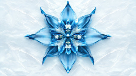 This stunning image features an intricate blue floral design with delicate petals that create a captivating symmetry against a soft white background, embodying beauty and serenity.