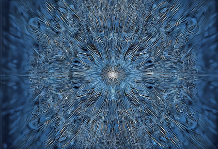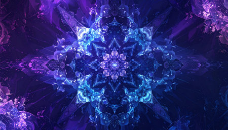 An intricate digital mandala unfolds in a mesmerizing display of cosmic energy. Crystalline structures in shades of sapphire blue and amethyst purple radiate from a central point, creating a portal to a realm of higher consciousness, meditation, and futuristic technology. This abstract background evokes a sense of wonder, spirituality, and infinite possibility.