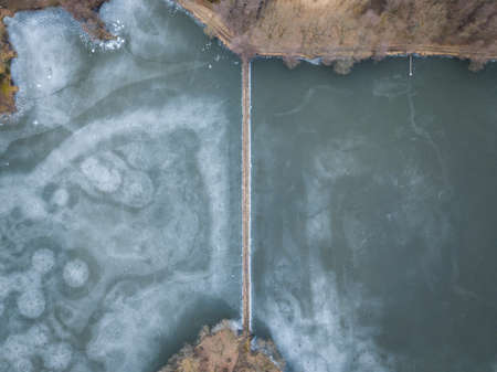 Top view of frozen lake in winter. Aerial view of frozen lake in winter.