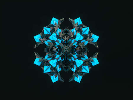 Abstract 3d geometric crystal mandala flower with neon light. faceted gem, winter snowflake.