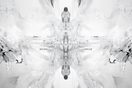 Complex and intricate abstract design composed of intersecting lines and shapes. The image is in grayscale and has a symmetrical structure, evoking a sense of crystalline forms or ice formations. The combination of light and dark tones creates depth and visual interest. The image is likely suitable for use as a background, a decorative element, or an artistic piece.
