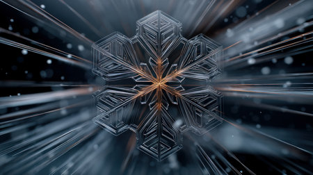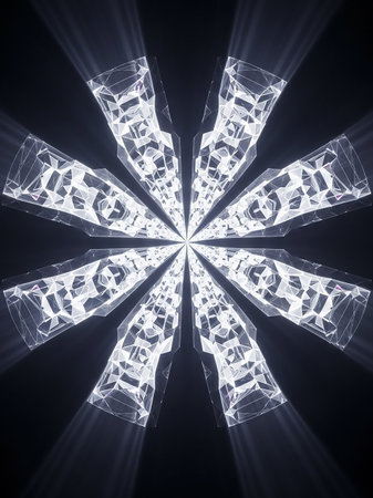 A symmetrical, abstract geometric pattern resembling a crystal snowflake emanates light rays against a dark background.
