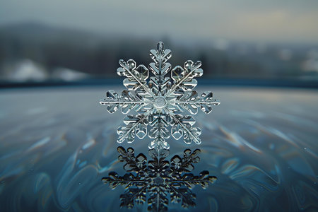 Illustration of photograph of a frozen snowflake on a glass, high quality, high resolution