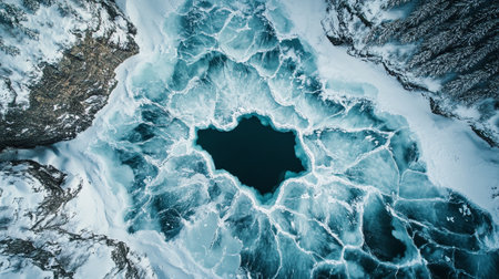 Ice floes on the water surface of the lake. Aerial top down view. Baikal lake, Siberia, Russia. Abstract nature background