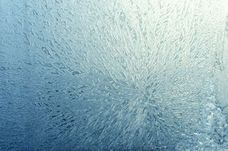 Frost texture on frozen glass illuminated by the sun in winter. Winter background.