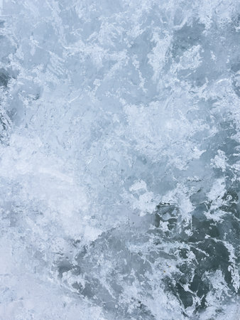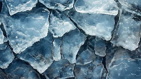 Ice forms intricate patterns and textures on the surface of a frozen lake, creating a stunning display of natures artistry in shades of blue and white