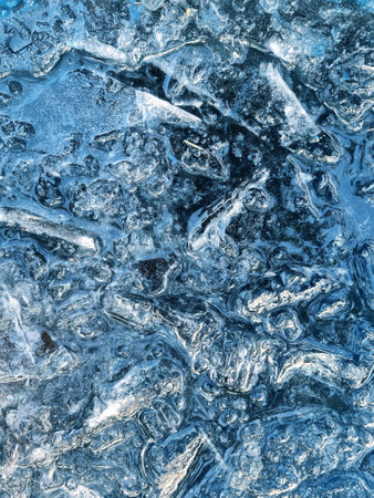 Close up of pieces of ice on frozen lake or river. Shatters of cracked ice closeup. Broken ice on the lake. Winter background.