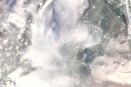 Texture and pattern of transparent ice with frozen air bubbles. Abstract ice background for design.