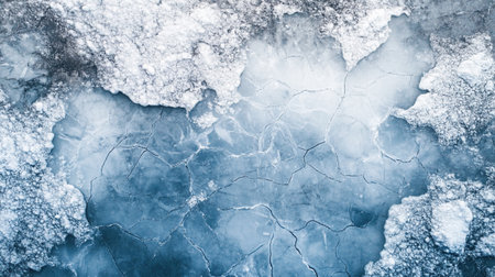 Aerial View of Cracked Ice Surface with Intricate Patterns. Concept of Natural Textures, Winter Beauty, Cold Environment, and Fragility of Nature. Banner. Background. Copy space.